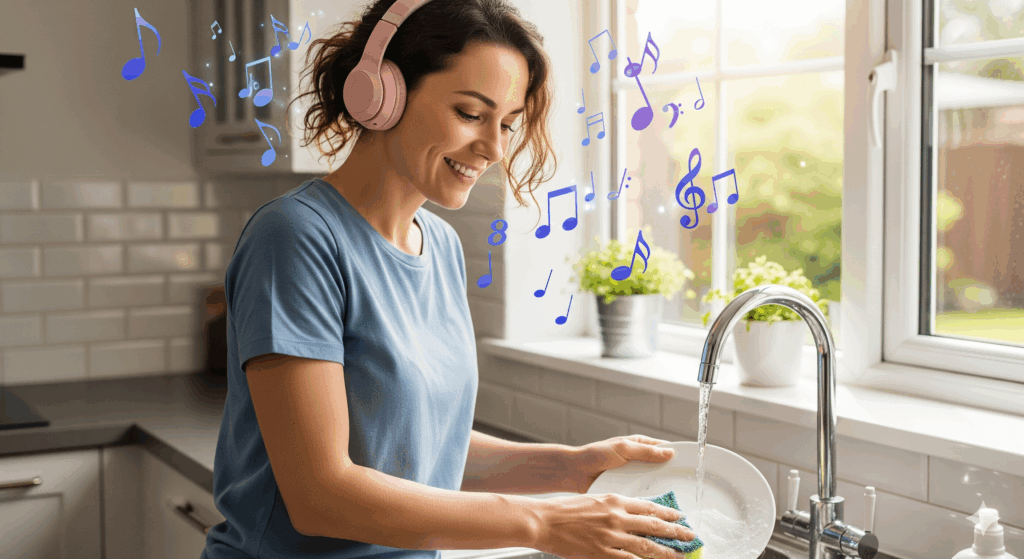 ช่วยให้สมองโฟกัสกับกิจกรรม และลดความตึงเครียด การฟังเพลงที่ชอบ หรือพอดแคสต์เกี่ยวกับเรื่องสนุก ๆ ขณะล้างจาน จะช่วยให้สมองโฟกัสและเพลิดเพลิน เป็นเหมือนช่วงเวลาที่เราได้ รีชาร์จจิตใจ หลังมื้ออาหาร