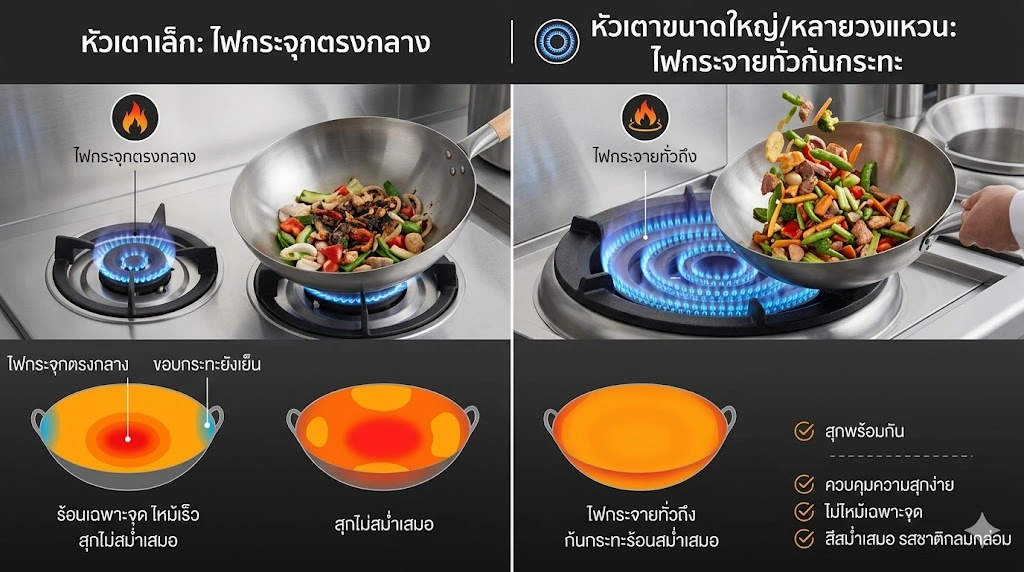 หัวเตาเป็นตัวกำหนด “รูปแบบการกระจายไฟ” โดยตรง เตาที่มีหัวเตาขนาดใหญ่ หรือแบบ 2–3 วงแหวน จะให้เปลวไฟกระจายออกเป็นวงกว้าง ครอบคลุมก้นกระทะได้มากขึ้น ต่างจากหัวเตาเล็กที่ไฟจะกระจุกอยู่ตรงกลาง