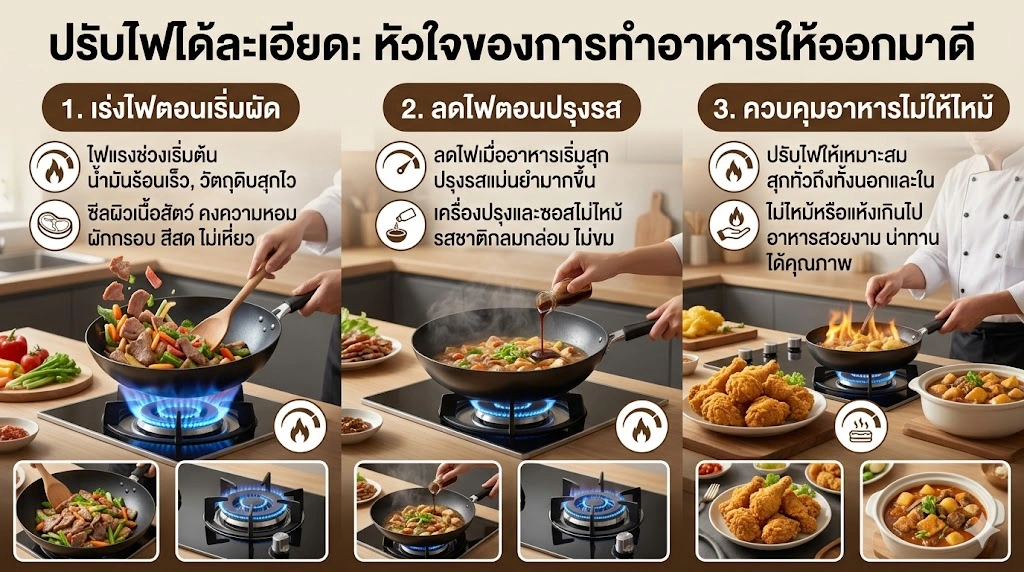 แม้จะเน้นไฟแรงเป็นหลัก แต่ “การควบคุมไฟ” คือหัวใจสำคัญของการทำอาหารให้ออกมาดีทั้งรสชาติและหน้าตา เตาที่สามารถปรับระดับไฟได้ละเอียดจะช่วยให้คุณจัดการแต่ละขั้นตอนของการทำอาหารได้แม่นยำมากขึ้น โดยแต่ละช่วงมีความสำคัญดังนี้