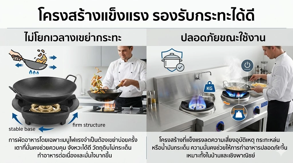 เมนูผัดส่วนใหญ่มักใช้กระทะเหล็กหรือกระทะก้นลึก (Wok) ที่มีน้ำหนักมาก รวมถึงต้องมีการขยับหรือเขย่ากระทะอยู่ตลอดเวลา ดังนั้นเตาที่มีโครงสร้างแข็งแรงและฐานมั่นคงจึงเป็นสิ่งสำคัญ เพื่อให้ใช้งานได้อย่างลื่นไหลและปลอดภัย โดยแต่ละข้อมีรายละเอียดดังนี้