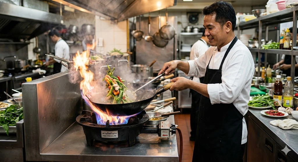 เมนูผัดไฟแรง เช่น ผัดกะเพรา ผัดซีอิ๊ว หรือผัดผักสไตล์จีน สิ่งสำคัญไม่ใช่แค่สูตรหรือวัตถุดิบ แต่คือ “ไฟ” ที่ต้องแรงและสม่ำเสมอ เพื่อให้ได้กลิ่นหอมเฉพาะตัว (Wok Hei) และทำให้อาหารสุกเร็วโดยยังคงความกรอบและสีสันของวัตถุดิบ
