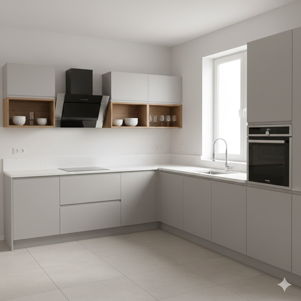 สำหรับมุมห้องที่มีพื้นที่สองด้านติดผนัง การจัดครัวรูปตัว L จะช่วยแบ่งโซนทำอาหารและโซนเก็บของได้ชัดเจน การออกแบบแบบนี้ทำให้ผู้ใช้งานสามารถเคลื่อนที่ระหว่างอ่างล้างจาน เตา และเคาน์เตอร์เตรียมอาหารได้อย่างสะดวก ซึ่งเหมาะกับการทำอาหารคนเดียวหรือแม้กระทั่งการทำอาหารพร้อมกันสองคนโดยไม่เกะกะกัน นอกจากนี้ ครัวรูปตัว L ยังสร้างมุมทำงานที่เป็นสัดส่วน สามารถเพิ่มช่องเก็บของหรือชั้นวางอุปกรณ์ได้เต็มประสิทธิภาพ