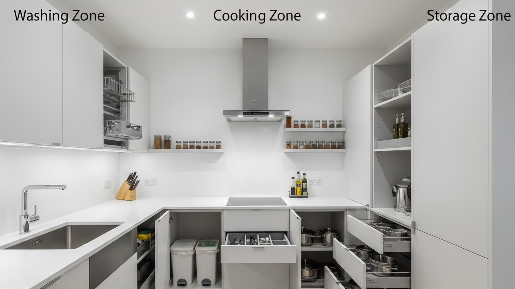 เป็นจุดเริ่มต้นของทุกการทำอาหาร อ่างล้างจานคุณภาพสูงถือเป็นหัวใจของโซนนี้ การมีช่องใส่ฟองน้ำและอุปกรณ์ล้างจานแบบซ่อนช่วยให้เคาน์เตอร์เรียบร้อยและไม่เกะกะสายตา ชั้นวางจานแบบดึงลงง่ายช่วยให้การจัดเก็บสะดวกและเข้าถึงได้รวดเร็ว การจัดโซนล้างอย่างเป็นระเบียบไม่เพียงแต่ช่วยให้ล้างจานง่าย แต่ยังช่วยรักษาความสะอาดและสุขอนามัยในครัว
