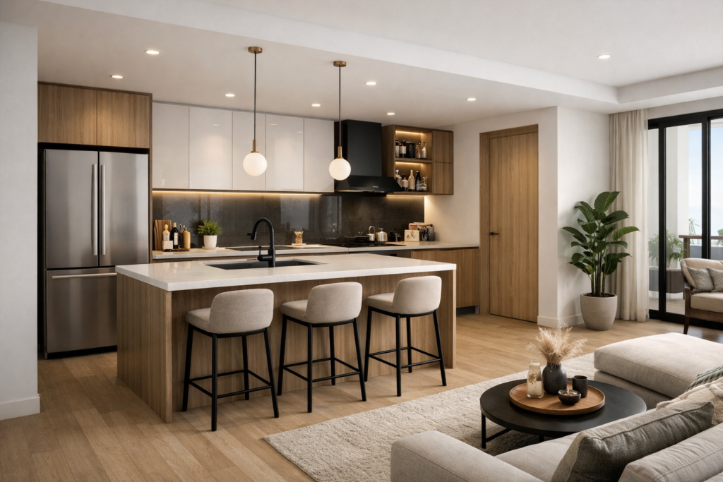 3. ครัวแบบกึ่งเปิดโล่ง (Open Plan Layout)