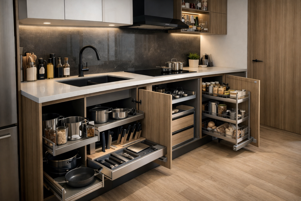 อุปกรณ์จัดระเบียบลิ้นชัก (Drawer Organizers) ซึ่งช่วยแบ่งช่องเก็บช้อน-ส้อม เครื่องครัว หม้อ และกระทะอย่างเป็นระบบ ทำให้การหยิบใช้งานรวดเร็ว และลดความยุ่งเหยิงที่มักเกิดขึ้นในครัวเล็ก