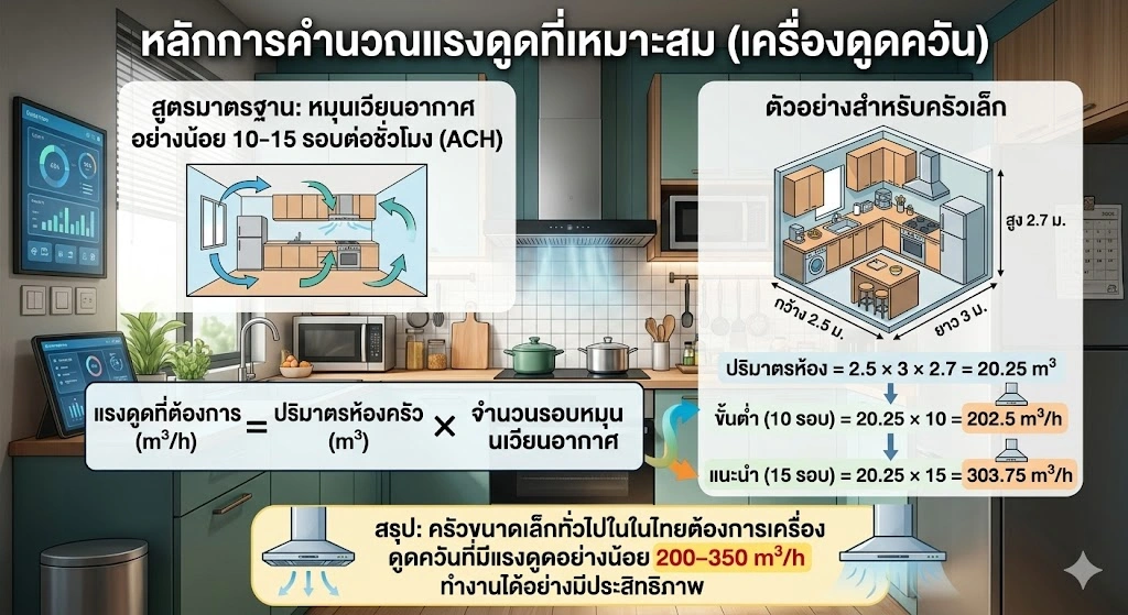 มีสูตรมาตรฐานที่นักออกแบบระบบระบายอากาศใช้กันทั่วโลก คือการหมุนเวียนอากาศในห้องครัว อย่างน้อย 10–15 รอบต่อชั่วโมง (Air Changes Per Hour)