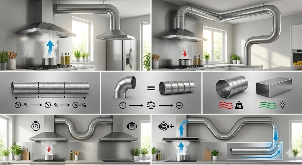 ท่อระบายควันที่ยาวและมีข้องอมากจะสร้างแรงต้านให้กับมอเตอร์ ทำให้แรงดูดจริงที่ปลายเครื่องลดลงจากสเปกที่ระบุในกล่อง