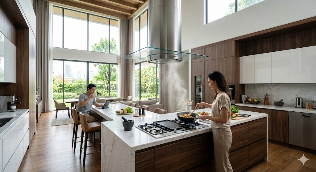 เหมาะกับครัวแบบ Open Plan ที่เตาอยู่กลางห้อง ดีไซน์หรูหรา แต่ราคาสูงและต้องการเพดานสูง ไม่ค่อยเหมาะกับครัวเล็ก