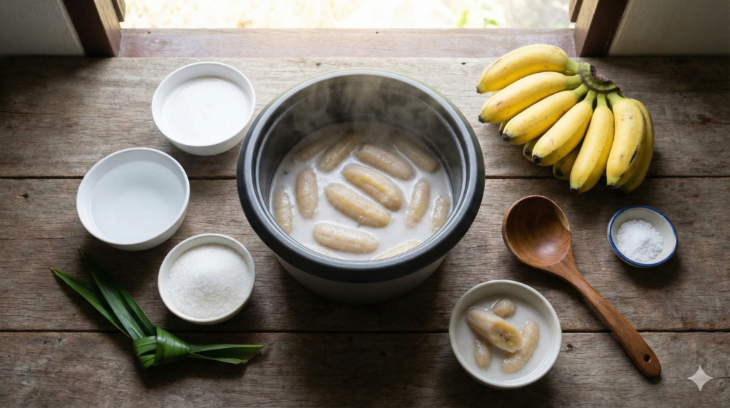 - ใส่กล้วยลงไป เคี่ยวต่อประมาณ 10–15 นาที