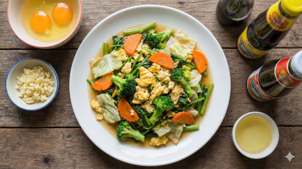 - ผักรวมตามชอบ (คะน้า แครอท กะหล่ำปลี หรือผักบุ้ง)