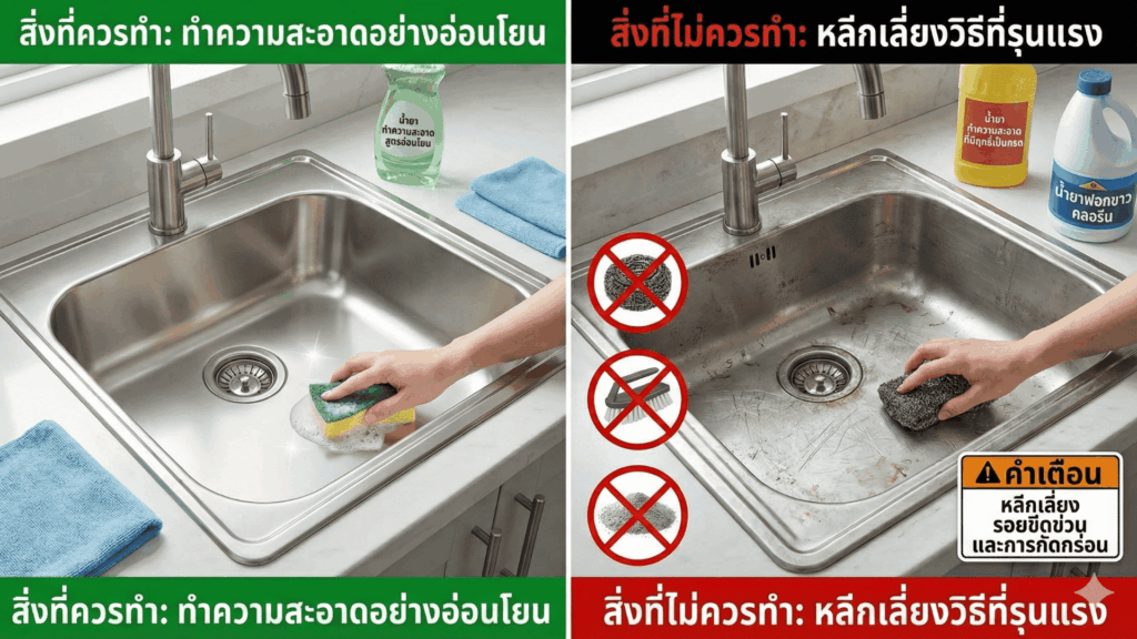 ควรหลีกเลี่ยงการใช้ฝอยเหล็ก แปรงแข็ง หรือผงขัดหยาบ เนื่องจากอาจทำให้ผิวสแตนเลสเป็นรอยลึกและกลายเป็นจุดสะสมของคราบสกปรกในอนาคต รวมถึงควรหลีกเลี่ยงน้ำยาทำความสะอาดที่มีฤทธิ์กัดกร่อนสูง เช่น น้ำยาที่มีกรดหรือคลอรีนเข้มข้น เพราะอาจทำให้ผิวอ่างเกิดการกัดกร่อนหรือเปลี่ยนสีได้