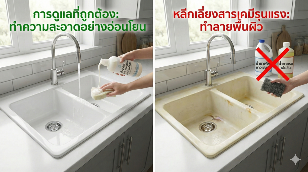การดูแลอ่างล้างจานหินสังเคราะห์หรือแกรนิตอย่างถูกวิธี จะช่วยให้อ่างคงความสวยงาม ทนทาน และใช้งานได้ยาวนาน พร้อมช่วยลดปัญหากลิ่นอับและคราบสะสมในครัวได้อย่างมีประสิทธิภาพ