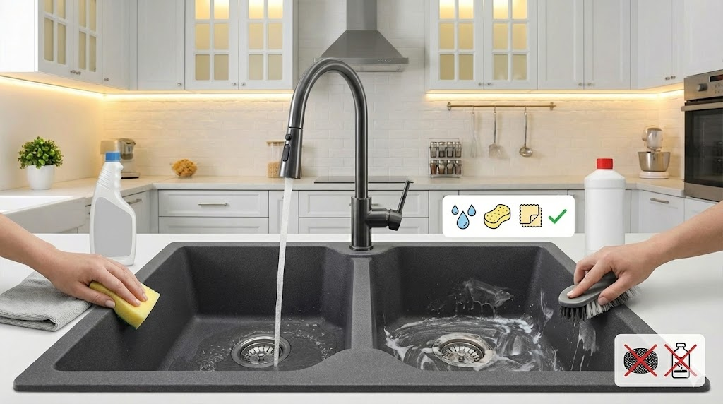 การทำความสะอาดอ่างหินสังเคราะห์ควรล้างทันทีหลังใช้งาน โดยใช้น้ำยาทำความสะอาดสูตรอ่อนโยนหรือผลิตภัณฑ์ที่ออกแบบมาสำหรับอ่างแกรนิตโดยเฉพาะ ร่วมกับฟองน้ำเนื้อนุ่ม เพื่อขจัดคราบไขมันและสิ่งสกปรกโดยไม่ทำลายผิวอ่าง ควรหลีกเลี่ยงน้ำยาที่มีฤทธิ์กัดกร่อนสูง เช่น น้ำยาที่มีกรดหรือด่างเข้มข้น เพราะอาจทำให้สีของอ่างซีดหรือผิวอ่างด้านลงได้
