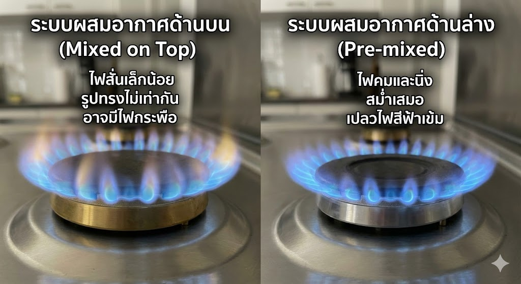ต่างจากระบบผสมอากาศด้านล่างที่ไฟจะคมและนิ่งกว่า เพราะผสมล่วงหน้าอย่างสม่ำเสมอ อย่างไรก็ตาม สำหรับการใช้งานครัวเรือนทั่วไป ความต่างนี้แทบไม่ส่งผลต่อการทำอาหาร