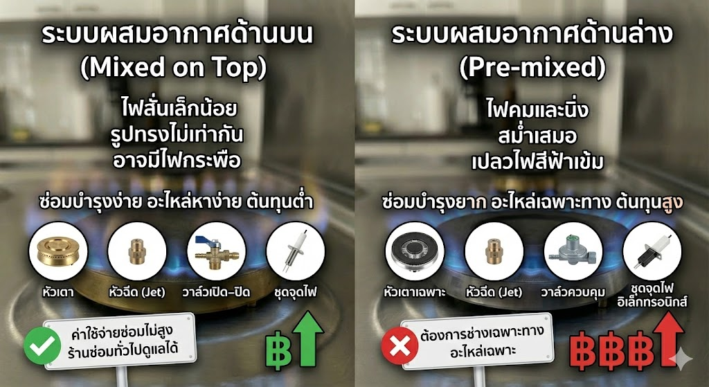 ตารางเปรียบเทียบเตาแก๊ส “ระบบผสมอากาศด้านบน” vs “ระบบผสมอากาศด้านล่าง”