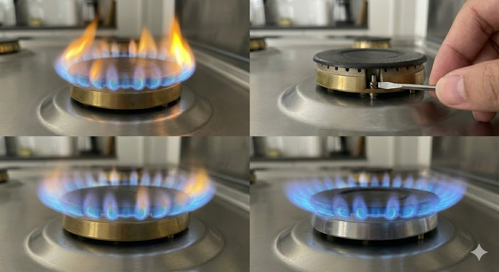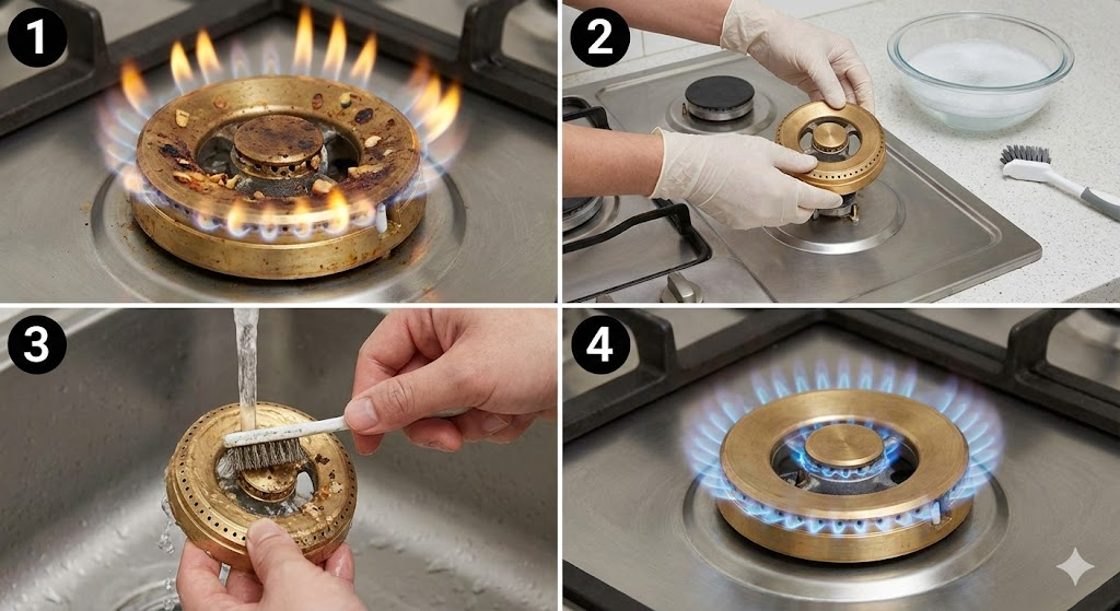 ควรทำความสะอาดรูหัวเตาเป็นประจำ เนื่องจากคราบอาหาร ฝุ่น หรือเศษแมลงอาจอุดตันรูไฟ ทำให้เปลวไฟไม่สม่ำเสมอหรือเกิดเขม่าได้ การถอดหัวเตาออกมาล้างและใช้แปรงเล็ก ๆ ทำความสะอาดรูแก๊สจะช่วยให้ไฟกระจายตัวดีขึ้น