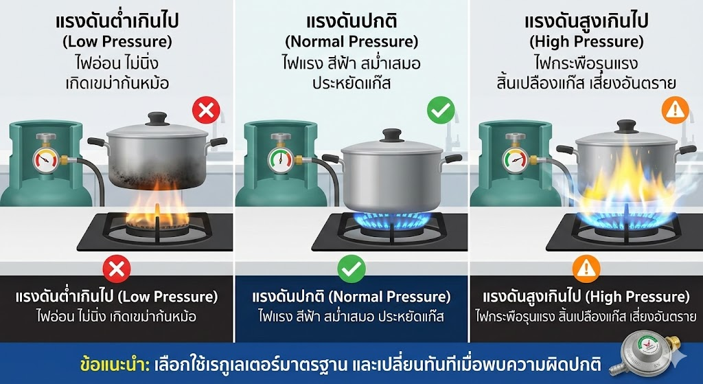ควรเช็กแรงดันแก๊สให้อยู่ในระดับเหมาะสม หากแรงดันต่ำเกินไปไฟจะอ่อนและไม่นิ่ง แต่ถ้าแรงดันสูงเกินไปไฟอาจกระพือหรือสิ้นเปลืองแก๊สมากขึ้น ควรใช้เรกูเลเตอร์มาตรฐานและเปลี่ยนเมื่อเริ่มมีอาการผิดปกติ