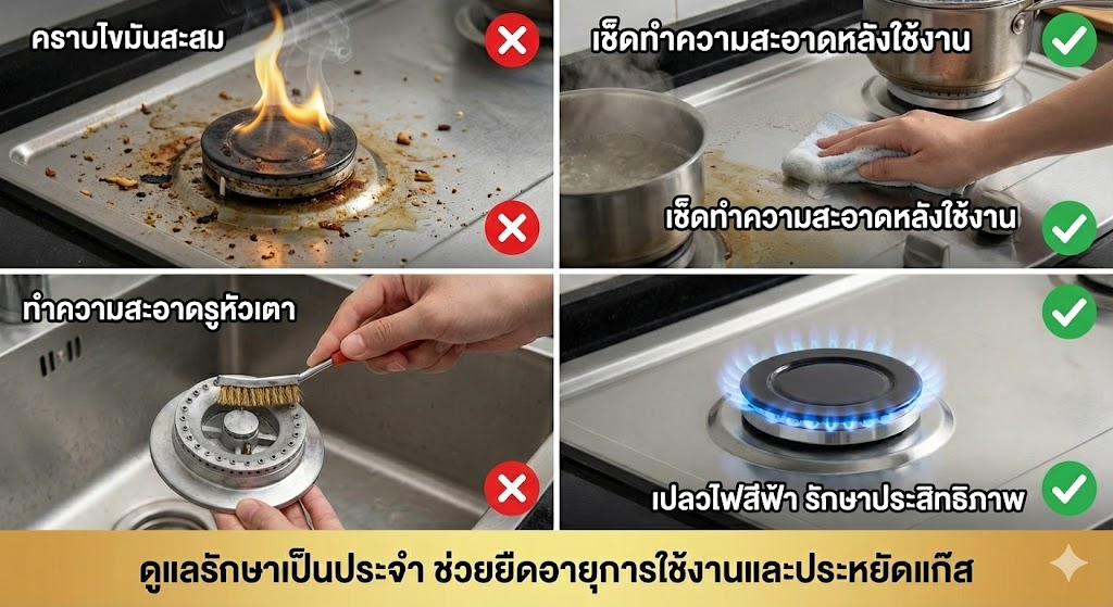 หลีกเลี่ยงการปล่อยให้คราบไขมันสะสมรอบหัวเตา เพราะคราบเหล่านี้สามารถไหลเข้าไปอุดตันช่องลมและรูหัวเตา ทำให้การผสมอากาศผิดสัดส่วน การเช็ดทำความสะอาดหลังใช้งานทุกครั้งจะช่วยยืดอายุการใช้งานและรักษาประสิทธิภาพของเตาได้ในระยะยาว